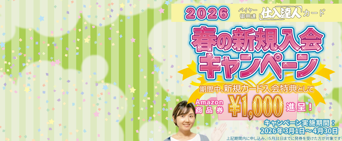 2026 春の新規入会キャンペーン プロバイヤーのための「仕入達人カード」新規会員大募集!!! 特典:¥1,000のAmazonギフト券をプレゼント 期間:2026.3.1~4.30 対象:期間内にお申し込みをされ、20 …続きを読む
